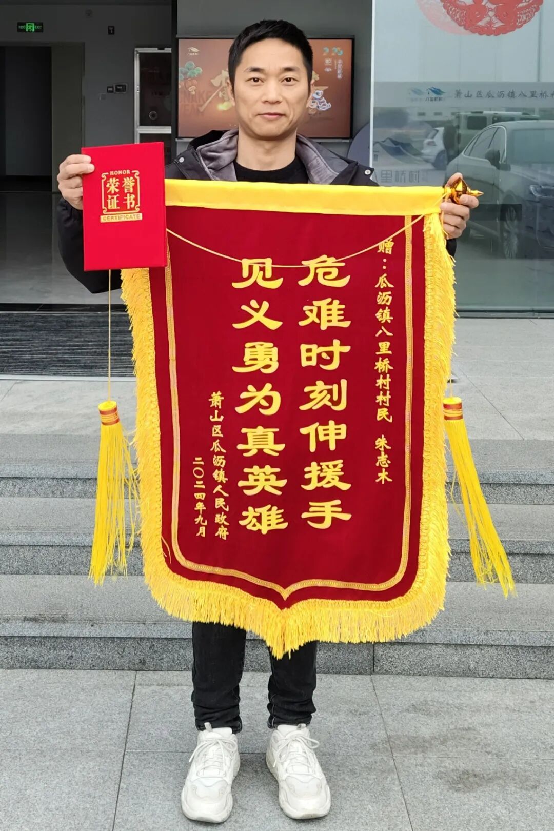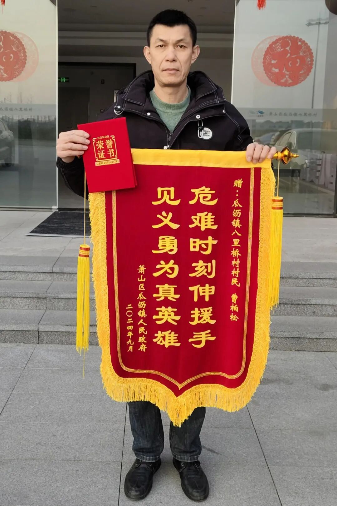 他们俩是东沙农村最普通的群众,然而就在2024年的9月20日上午,他俩不约而同奋不顾身的纵身一跃,救起的不只是八里桥村落水老人,更是一个家庭的完满。全然顾不上肋骨骨折的曹柏松面对老人的不慎落水,急中生智叫上了隔壁邻居朱志木,翻过岸边的护栏,先后跳入河里,合力以最快的速度将老人救上岸,紧接着以平时学到的急救方式现场进行了施救。看似他俩急中生智,挺身相救,其背后蕴含着是我们普罗大众临危时,散发出来的见义勇为的人性光辉。