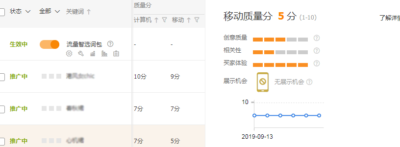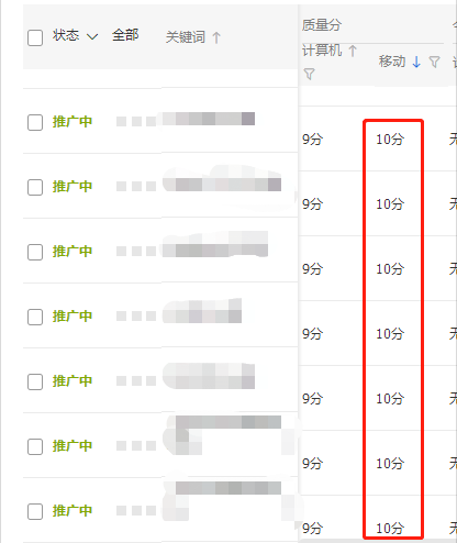 只要选对词,一般质量分就有7/8分,再对相关性、创意质量操作一下,保证点击率,质量分很容易就上10分了,像下图,就是我们操作三天后的效果。