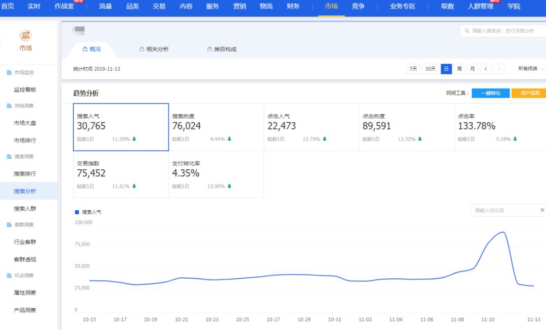 通过直通车后台-流量解析-输入关键词-查询来具体分析关键词的数据。