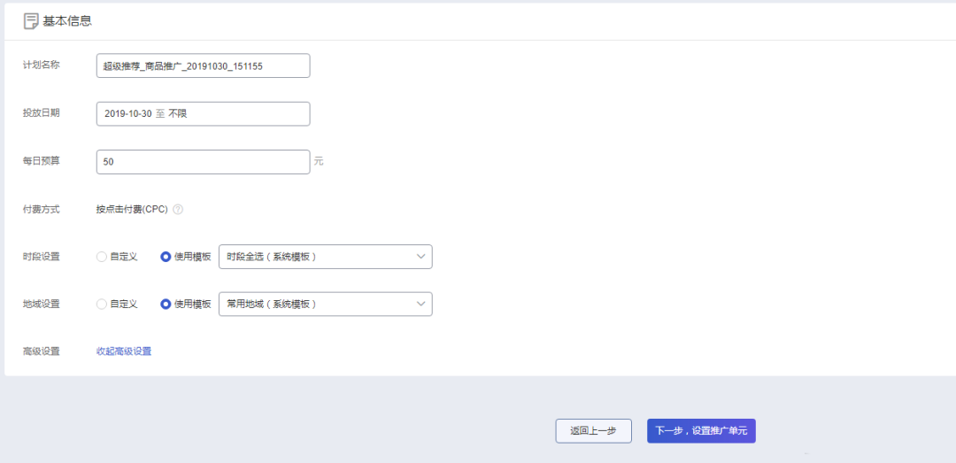 从计划名称、投放日期、付费方式、预算、地域、时间段等都在这一阶段设置。