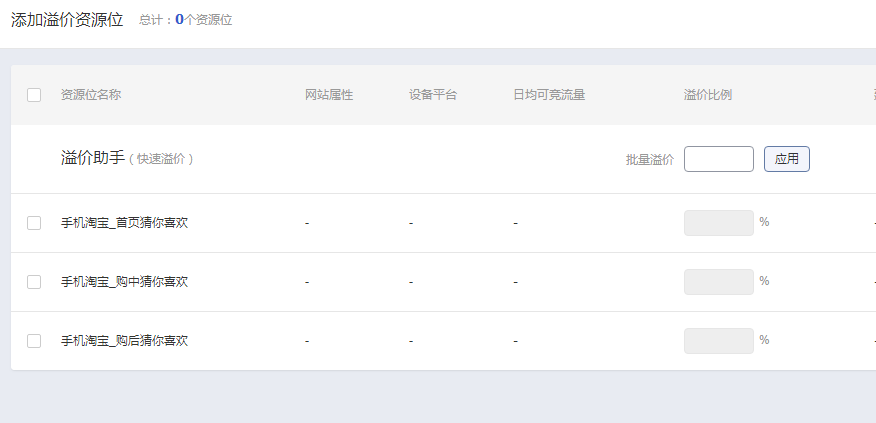 每一个计划针对一个资源位去设置溢价,后期能够更清晰地了解每个资源位的数据。溢价可以先20%-30%,之后再根据数据去调整。