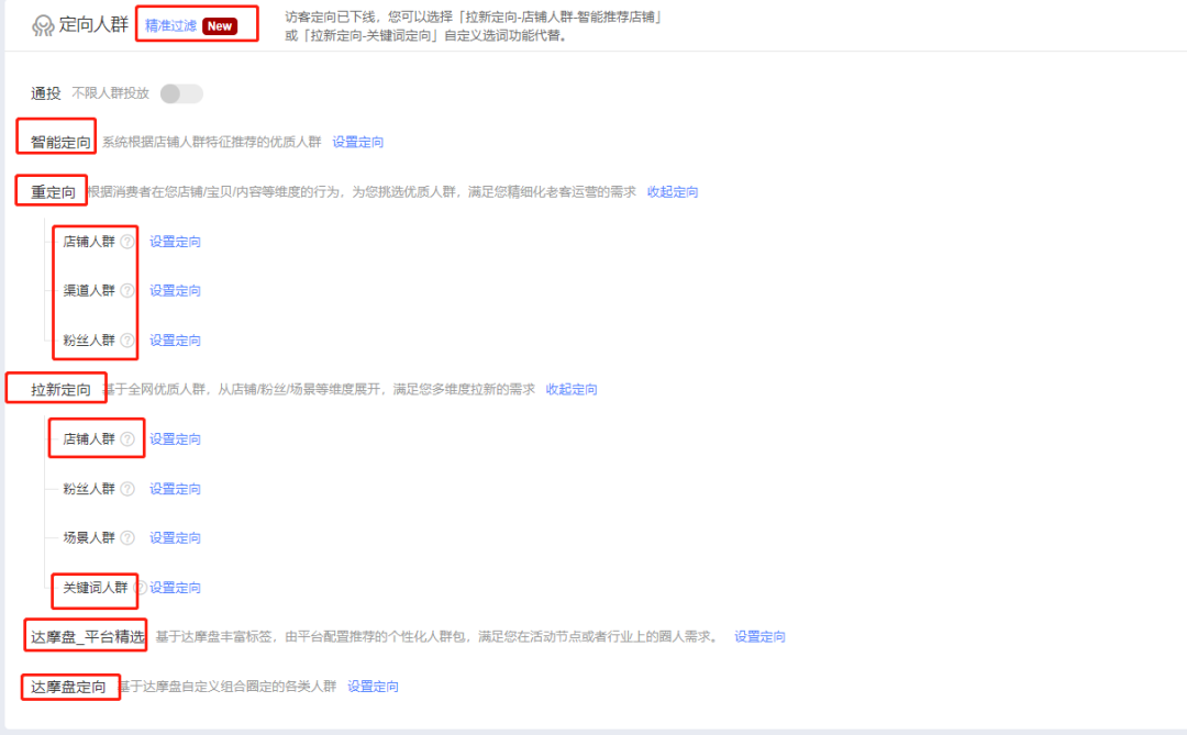 访客定向、营销场景定向、行业店铺定向、智能定向、相似宝贝定向、店铺型定向、达摩盘: