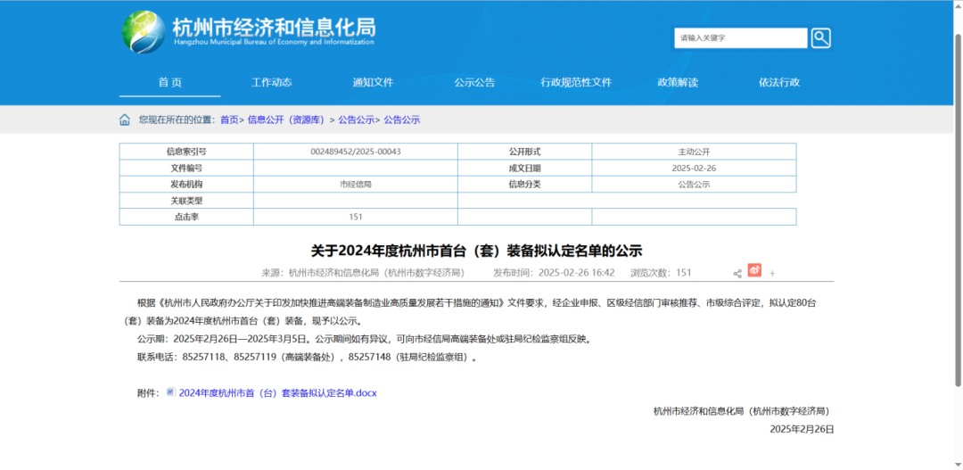 根据《杭州市人民政府办公厅关于印发加快推进高端装备制造业高质量发展若干措施的通知》文件要求,经企业申报、区级经信部门审核推荐、市级综合评定,拟认定80台(套)装备为2024年度杭州市首台(套)装备,现予以公示。