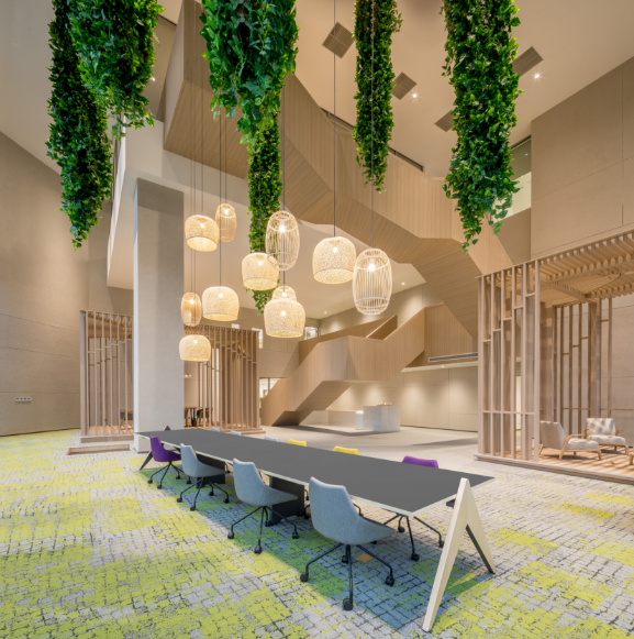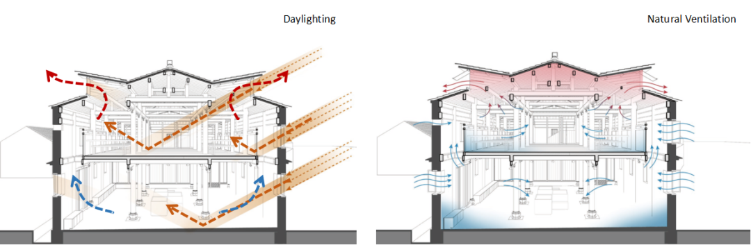 其次,对于启迪设计大厦内部,采用了“垂直院落”“空中环廊”“底层借景”“先抑后扬”等多种空间创作手法,提供了多重体验的内部空间。
