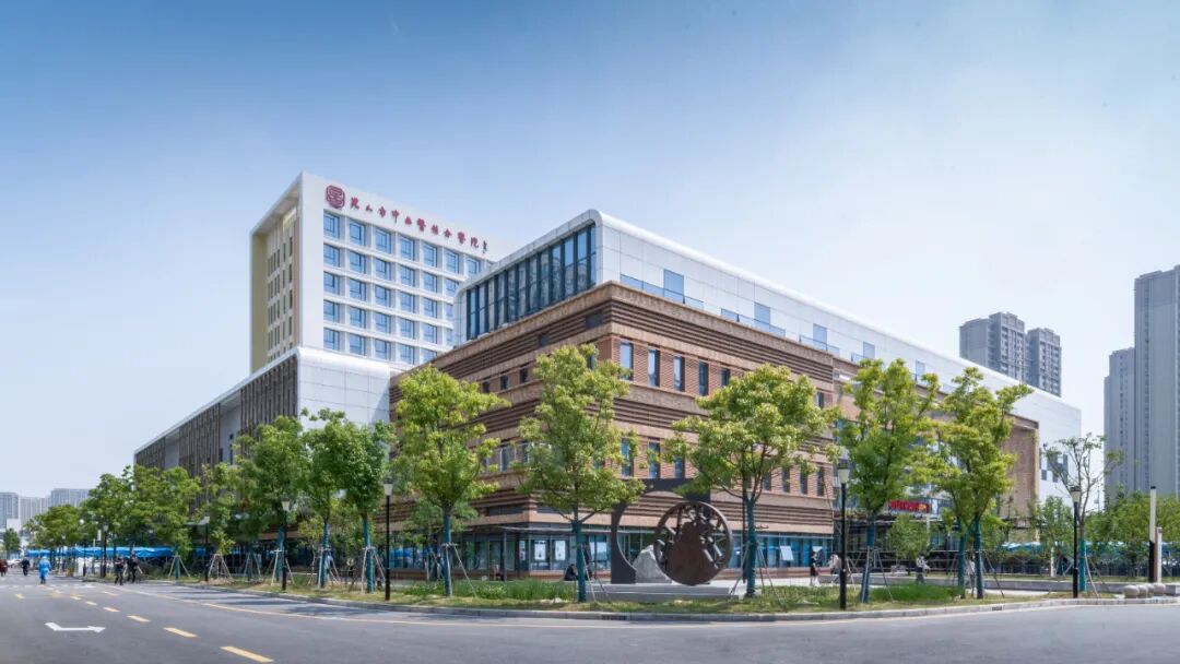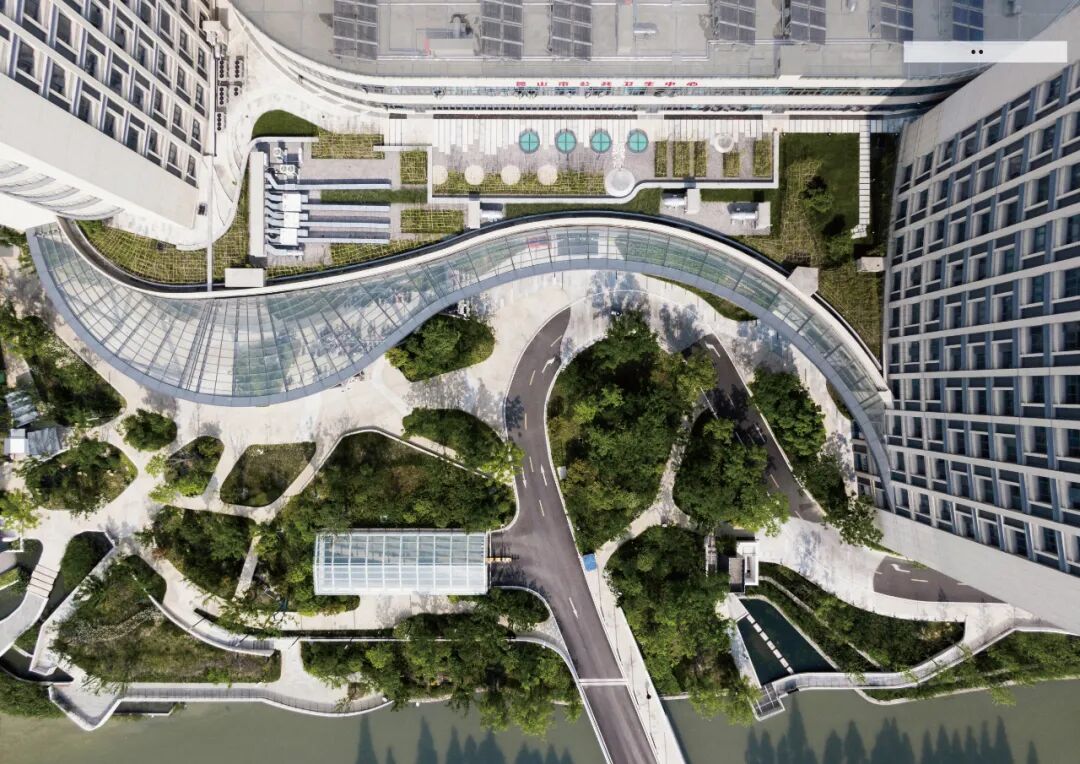 项目以绿色医院、生态建筑为建设目标,将可持续发展理念引入到设计中,力求营造出和谐宜人的生态环境。设计以楼前绿地,庭院绿地为点,以道路两侧绿化带和沿河绿化带为线,以门诊广场、探视广场、园林景观绿地为面,构成了院区点线面结合的三级绿化系统,让患者和医护人员更加接近自然,使建筑、绿化与人有机共生。