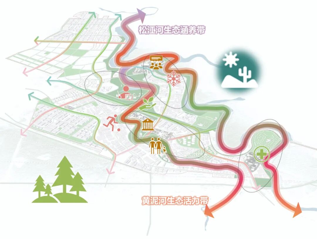将山水城视作生命共同体,有机融合滨水岸线及城市功能组团。以松江河生态涵养带作为城市与自然的边界,引导城市与自然生态有机共生;依托黄泥河生态活力带串联融入会议会展、冰雪旅游、休闲康养、温泉度假、人参文化体验等功能组团,形成多元活力、四季宜人的城市生态廊道。