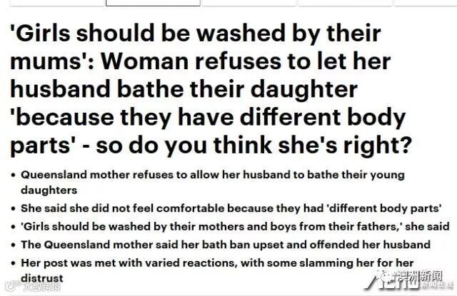 网友们迅速们站队,有的人十分的支持澳洲妈妈的做法,认为女孩就不应该和爸爸一起洗澡!