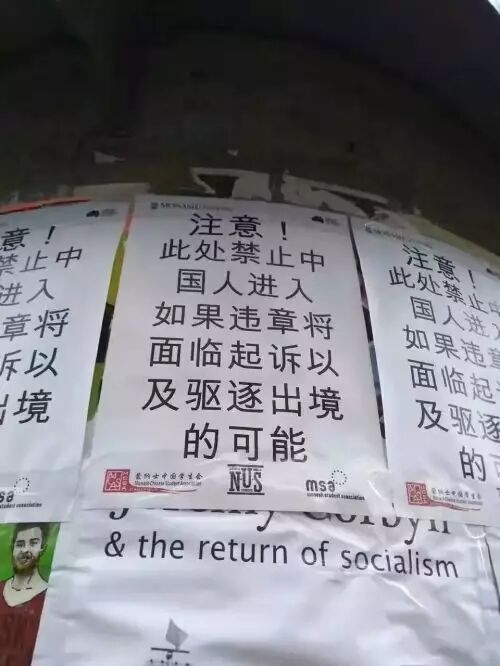 今天本来是澳洲各高校的开学日,对于广大中国新生来说,本是他们在外求学路的一个美好开端,然而一些怀有敌意的团体却给他们送上了一份令人不快的“见面礼”。据《环球时报》报道,在墨尔本大学、蒙纳士大学等知名高校内,出现了大量写着“此处禁止中国人进入”的海报。