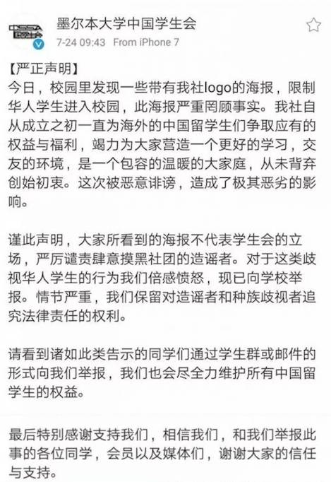 果不其然,在发生了这件事情后无辜中枪墨尔本大学CSSA立刻在官微上发布了一份严正声明进行了澄清,表示与此事无关,并且已经将此事上报学校,保留追究幕后主使者法律责任的权利。