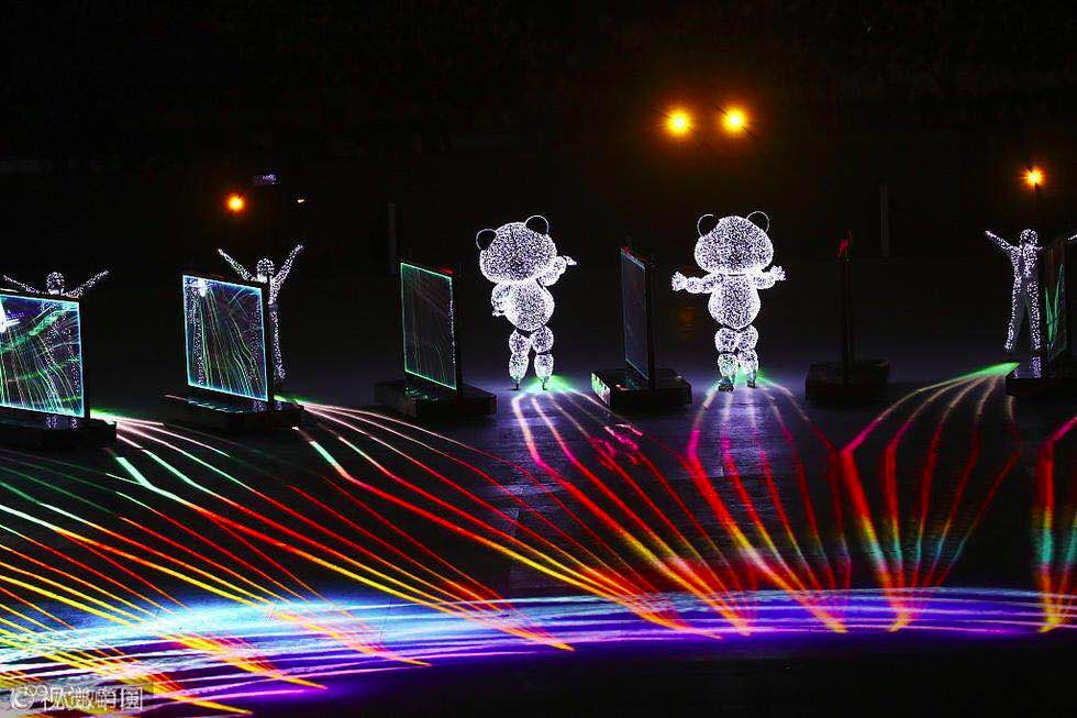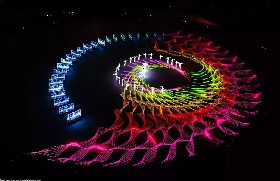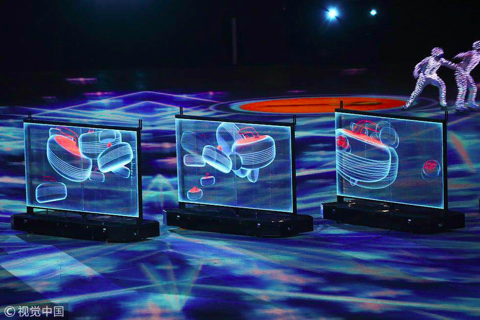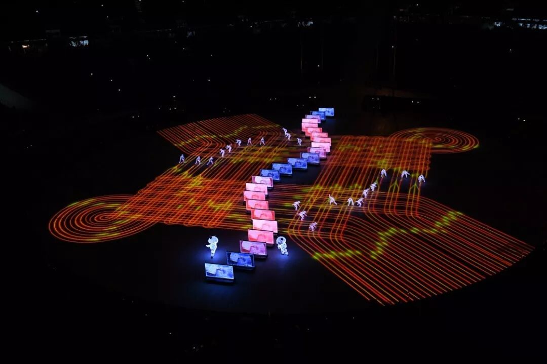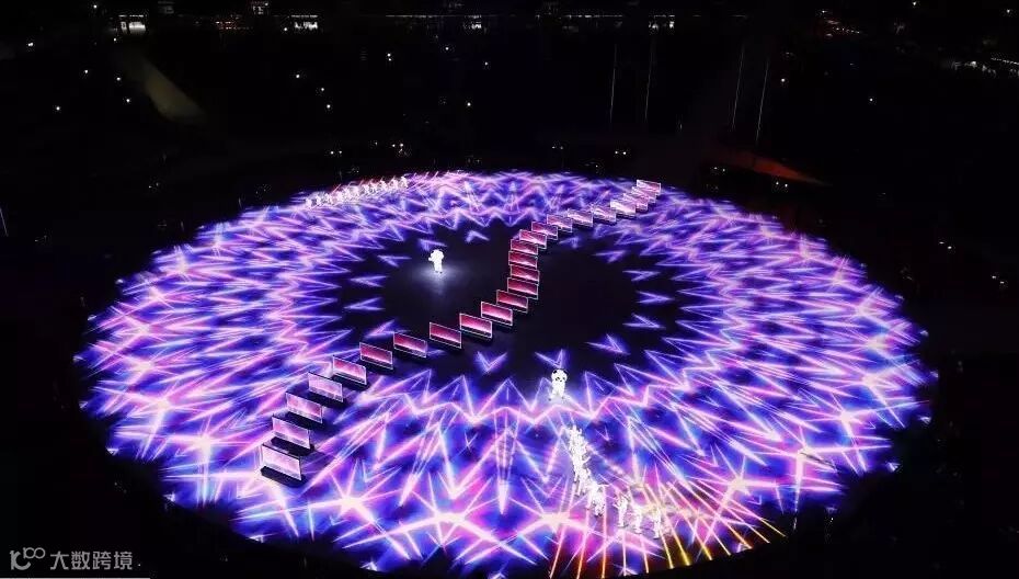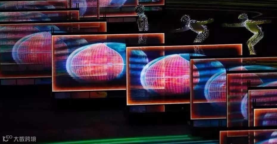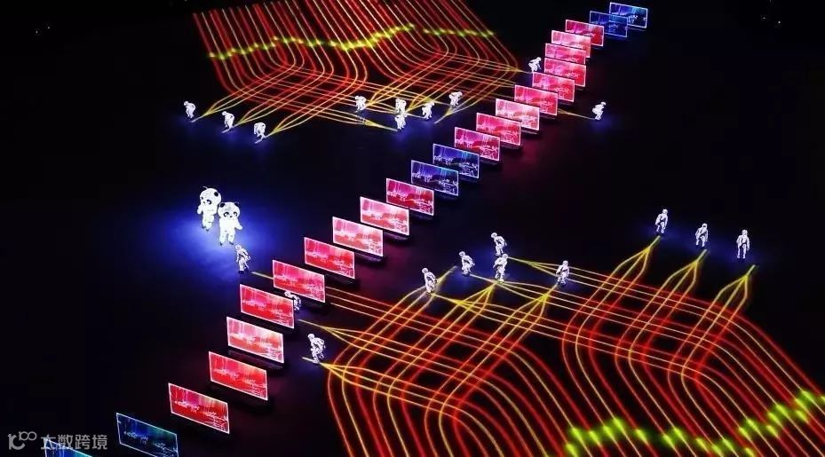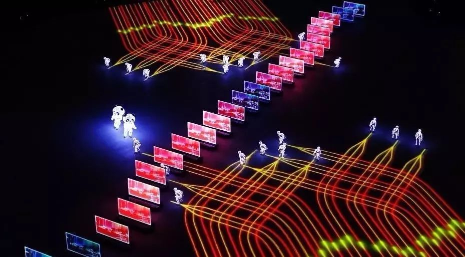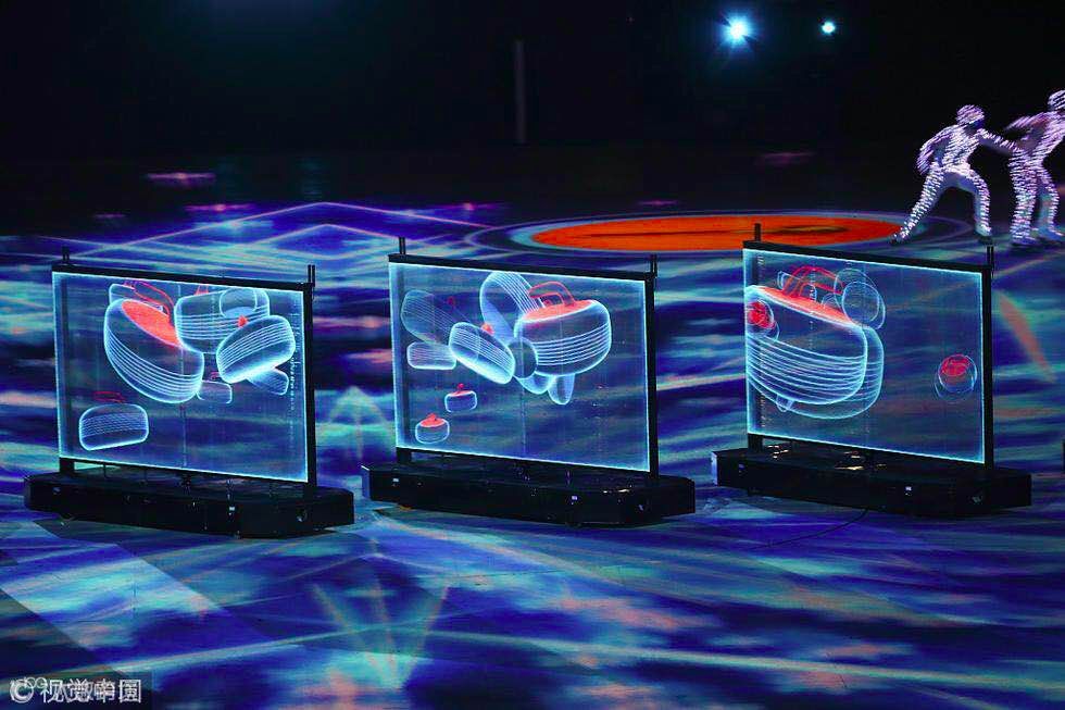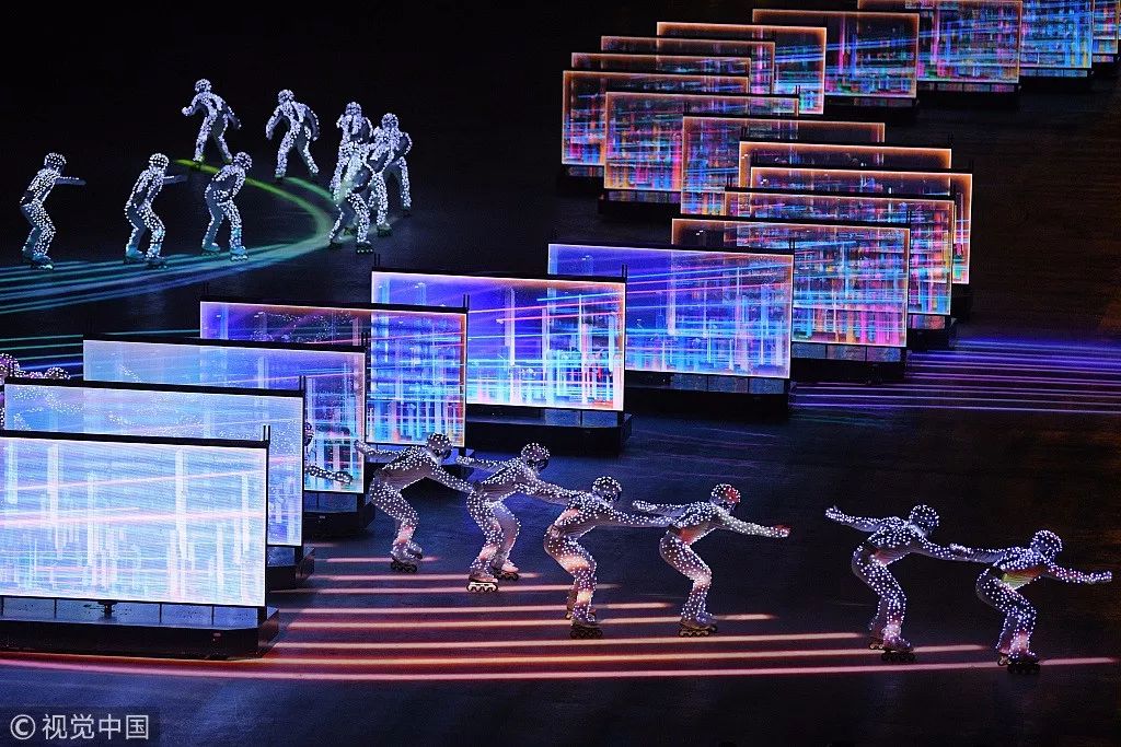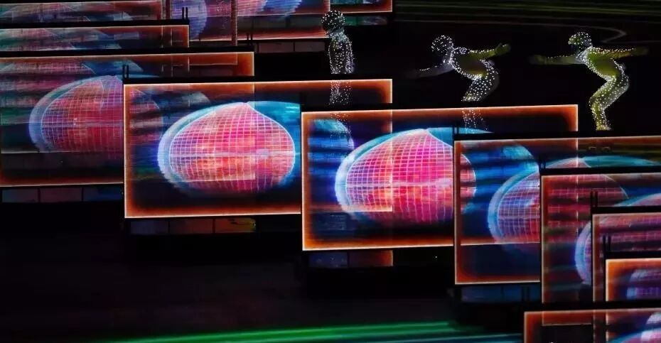 大家可以看到机器人身上装载的大屏幕使这次表演十分炫酷,移动的机器人,流动的画面形成了多层次,递进式的现场效果。为了体现冰雪主题,这些大屏幕也使用了新技术,最终打造成像冰雪一样效果的“冰屏”。