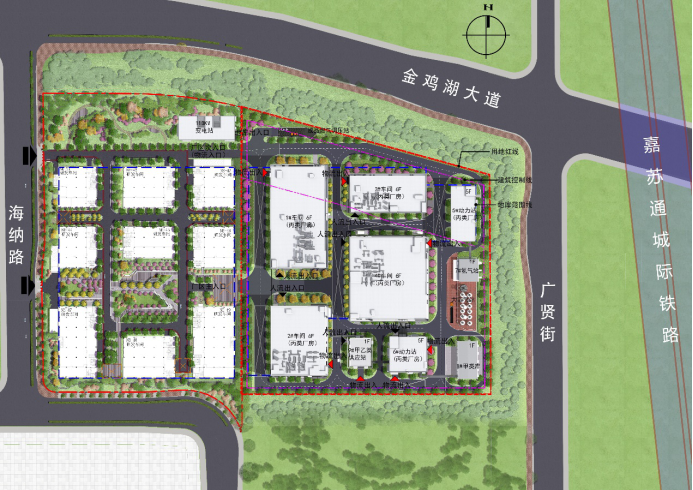 国家第三代半导体技术创新中心研发与产业化基地地块条件较为特殊,与市政道路无交接界面,需要借用已建地块出入口与城市道路连通。且地块产业定位为第三代半导体设计和生产,这一类产业对防微震和洁净要求非常高,而地块东侧距离140 米处拟建设城际高铁线路,存在一定的不利因素;另一方面,半导体产业需要设置大量辅助用房,其中还包括危险品库房和氢气站等甲类库房,与普通厂房之间需要留足间距,以保障安全性。