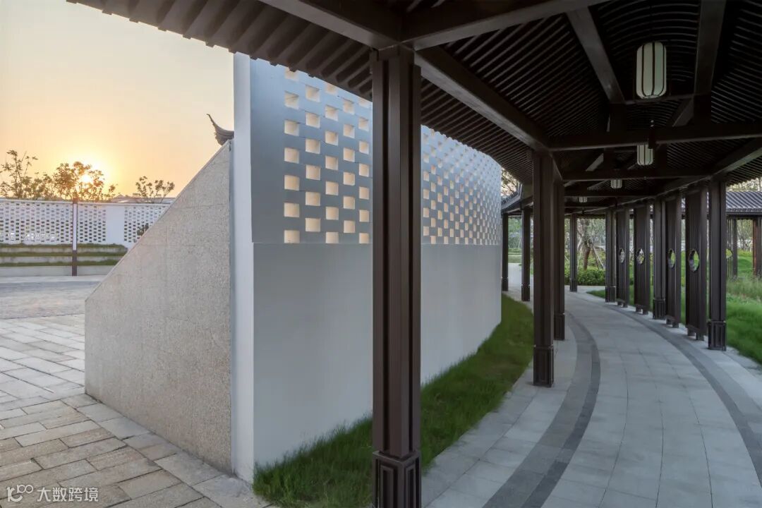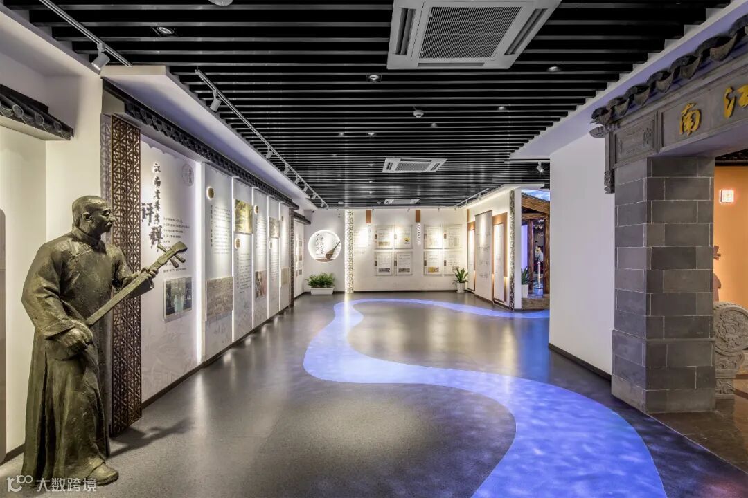 景观设计上,设计以评弹的学艺生涯过程为整个主题故事线,“寻,试,露,登,极”五大篇章,结合场景雕塑、演绎广场、互动小品等再现评弹历史文化。演绎了从拜师学艺,到出师黄埭的从艺故事。通过听评弹人生百态故事,漫步曲折迂回,柳暗花明游园之路,体悟人生。