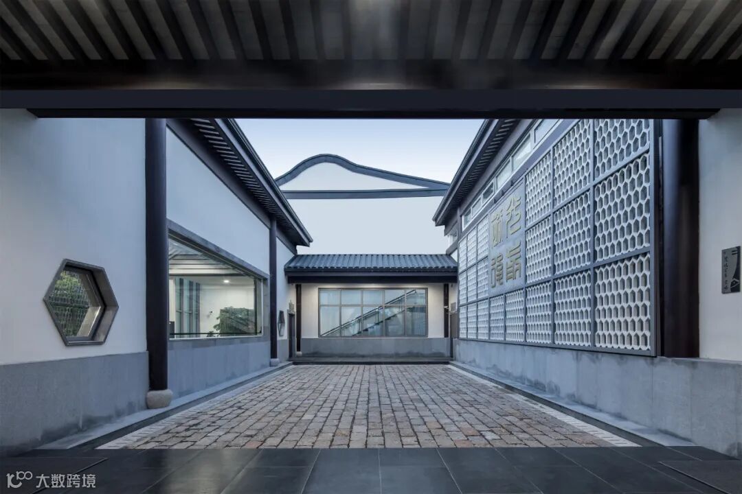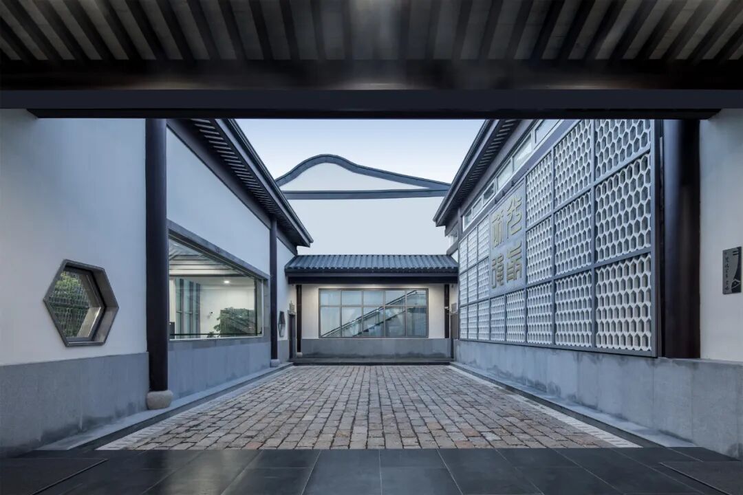 设计以苏式传统民居粉墙黛瓦为基色,取其进落的基本结构,以山墙间隔划分主次空间,其中围合院落天井,形成丰富的传统意象空间。山墙形式上,采用传统“观音兜”的硬山做法,对其进行现代转译,以连续起伏的山墙演绎评弹宛转悠扬的曲调。如此,沿河一岸,如重重民居起伏的屋面,层层叠叠的曲线山墙,与百年评弹的迤逦之音,在场地共鸣。