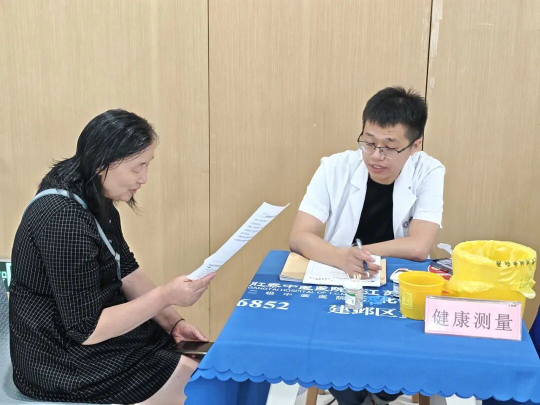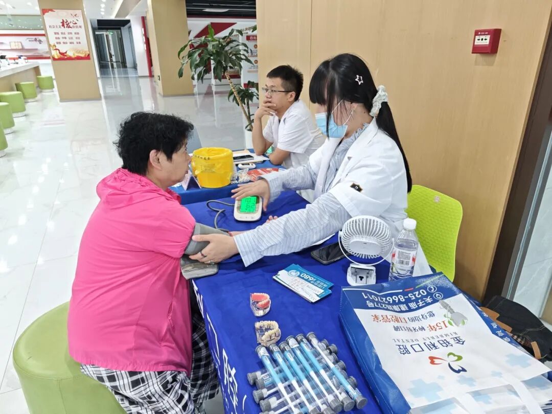 南京肛泰医院、金铂利口腔的医护团队搭起健康问诊台。前来量血压、测血糖的居民络绎不绝,医生针对三伏天易发的肠胃不适、口腔炎症等,给出相关建议,倡导科学养生。