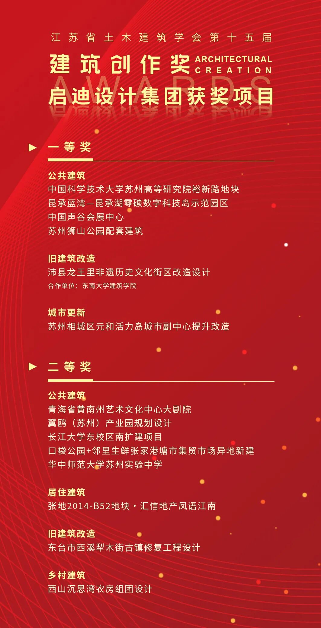 日前,江苏省土木建筑学会第十五届“建筑创作奖”评选结果正式出炉,启迪设计集团荣获14项大奖,其中一等奖6项,二等奖8项。