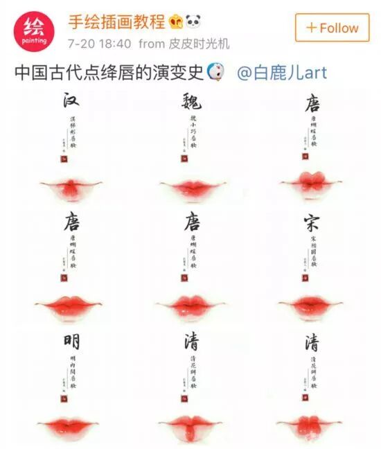 古代审美以樱桃小口为美,女性通常会模糊原来的基本唇形,甚至只画一半。剧中咬唇妆高度还原了古代唇形,并有意识地突出了下唇的颜色。