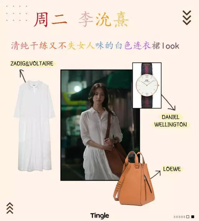 简洁的纯白衬衫式长款连衣裙,淡雅的颜色更突出清新低调的自然美,适中的长度,避免给人过于暴露的感觉,端庄而得体。搭配设计独特的棕色包包来增加整个look的亮点,以免颜色搭配过于单调。