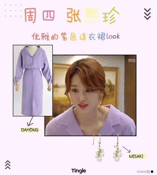 优雅的紫色连衣裙给人以淑女又干练的感觉。v字形的翻领设计和清爽透气的亚麻材质在夏天穿着也非常清凉舒适。袖口处的蝴蝶结演绎出甜美别致,设计独特的珍珠耳环也更显高贵优雅。