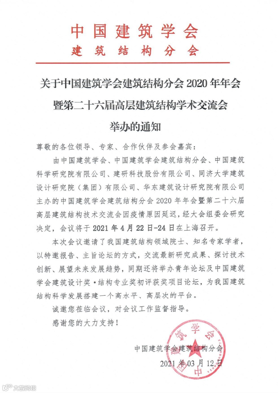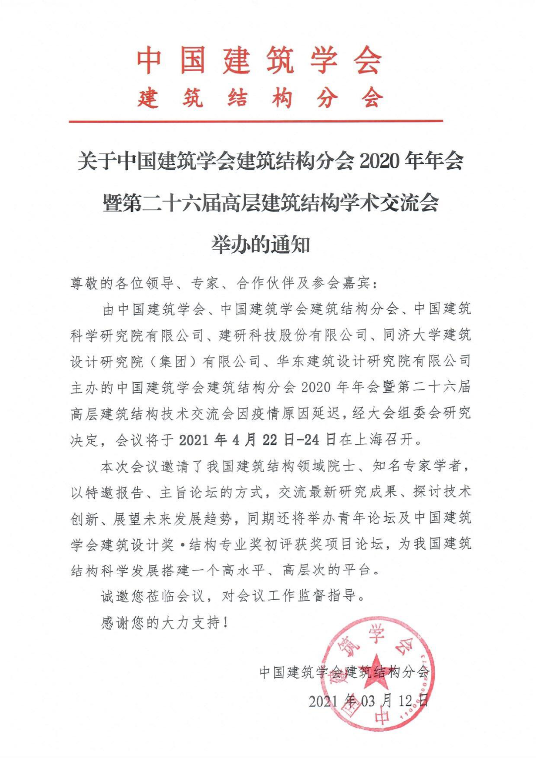 由中国建筑学会、中国建筑学会建筑结构分会、中国建筑科学研究院有限公司、建研科技股份有限公司、同济大学建筑设计研究院(集团)有限公司、华东建筑设计研究院有限公司主办的中国建筑学会建筑结构分会2020年年会暨第二十六届高层建筑结构技术交流会因疫情原因延迟,经大会组委会研究决定,会议将于2021年4月22日-24日在上海召开。