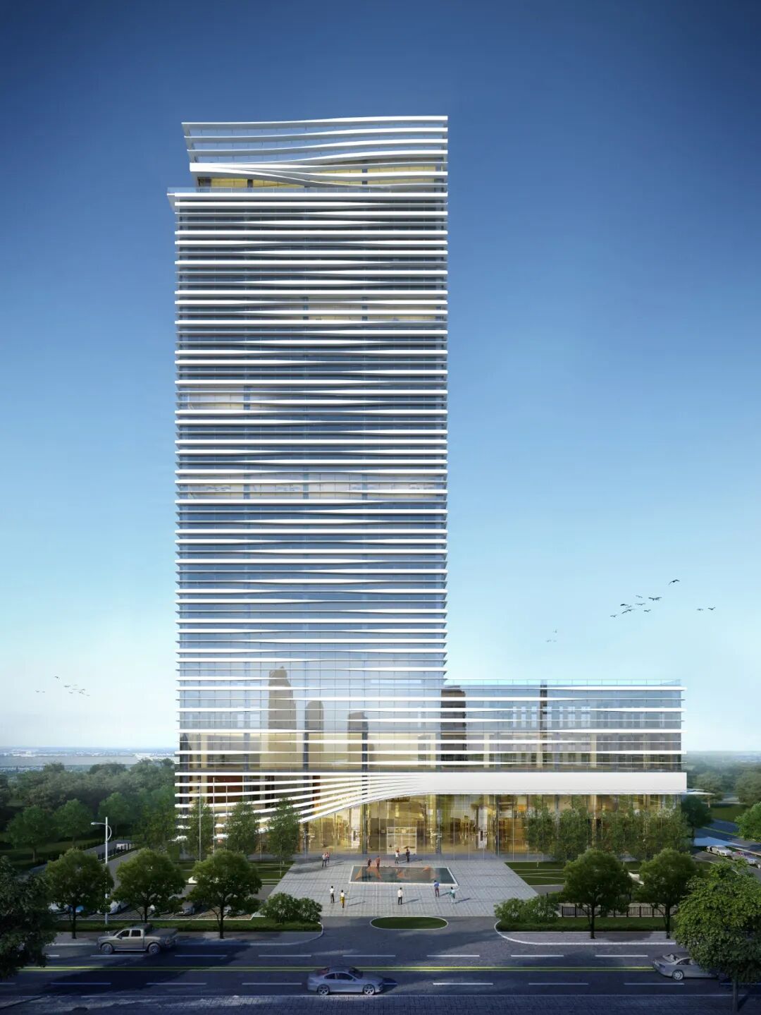 本项目采用流畅的线条元素雕刻、柔化建筑形体,沐风而生,亭亭玉立,让建筑也成为生长在太湖岸边的一道特殊风景。