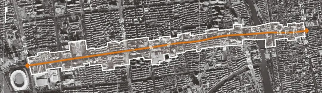 整治工程范围西起西环路,东至养育巷。全长3.8 公里,沿道路红线两侧各约50米范围内(以两侧开发地块进深为依据)均列入整治范围。沿街建筑界面整治范围为道路两侧视线所及的建筑,总用地约40公顷。