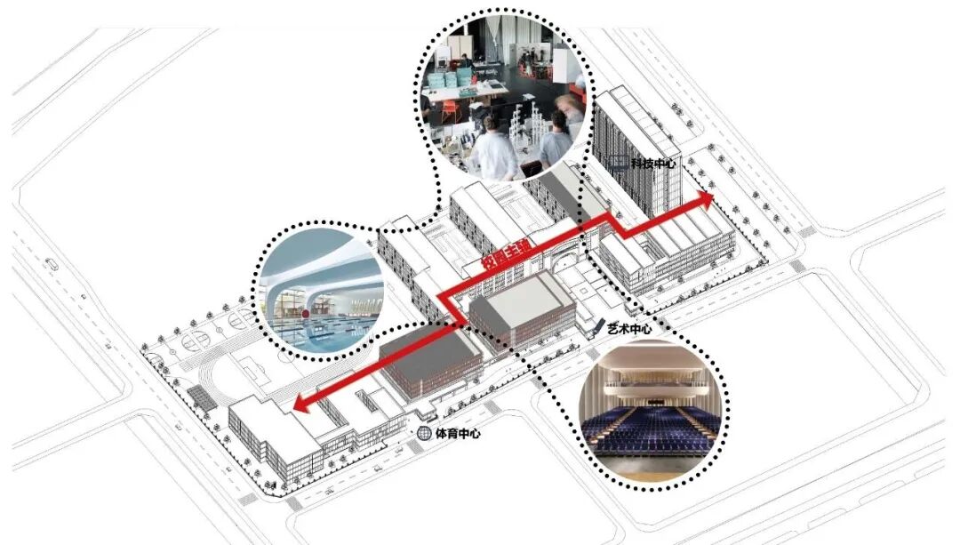 “一轴三中心”是统领整个学校的规划结构。“一轴”是学校形态的规划主轴,也是校园功能连接轴,更是复合多种活动的交流轴,它串联起了学校6个年级师生的生活。“三中心”为建设方与建筑师共同开发的学生素质教育中心,整合了传统学校的体育运动、艺术表演和科学实验,形成新的体育中心、艺术中心和科技中心,为学生们素质教育课程提供专业的指导。