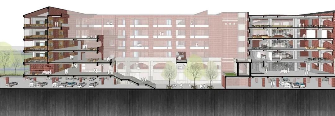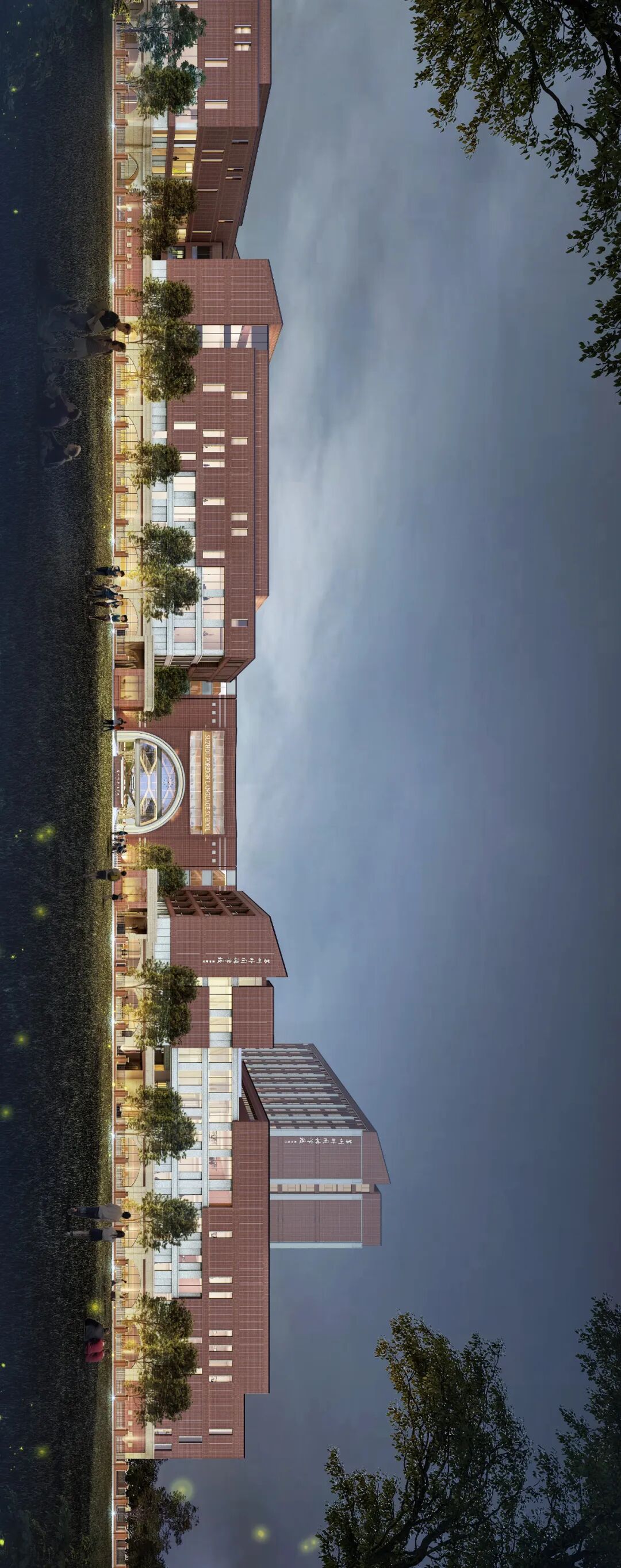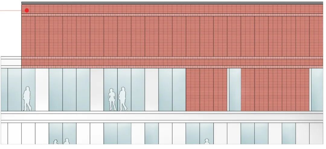 在城市层面缝合与创新,是本设计对于整体文脉的继承和发展。在城市街景层面,红白相间的立面色彩,是一种活跃城市气氛的材质表达,具有历史厚重感的砖红色柔石,配合米白色面砖形成学校入口强烈的视觉冲击,在白天和夜晚,都能为吴中区提供了一种全新的教育景观。