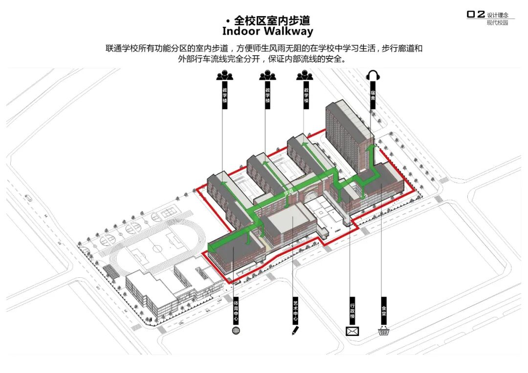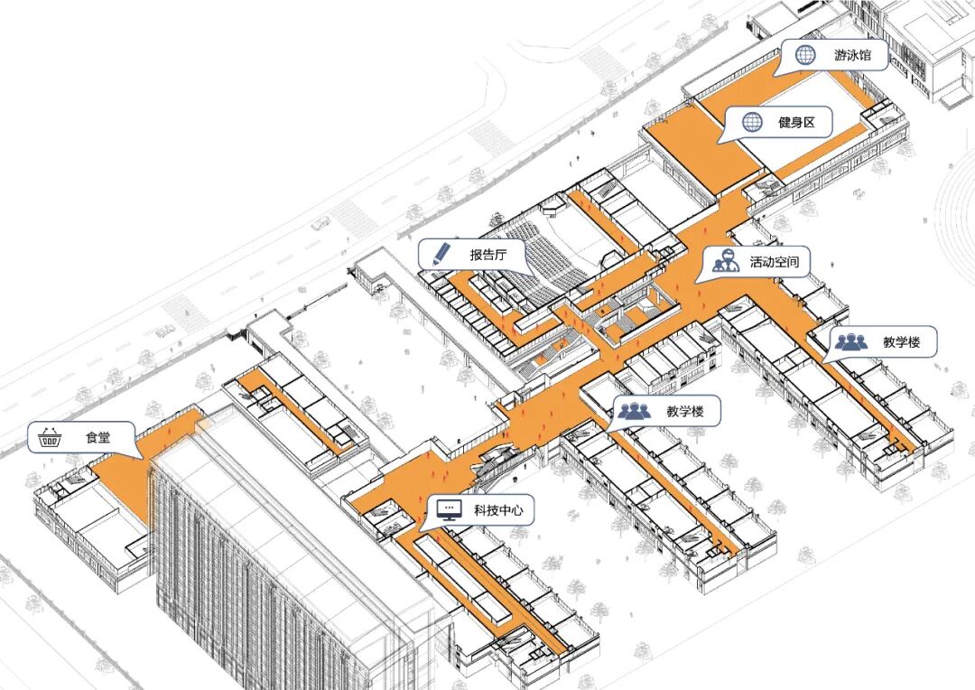 这条走廊不仅仅包含多功能多维度的功能复合,还是学生们能风雨无阻到达学校各个功能部分的保证。通过对校园功能的充分分析和有机组织,这条走廊自最南端的体育中心开始,经过教学部分、食堂部分最终到达宿舍部分,不但是一个简单的空间,更是师生生活的凝固,是学生成长的见证。