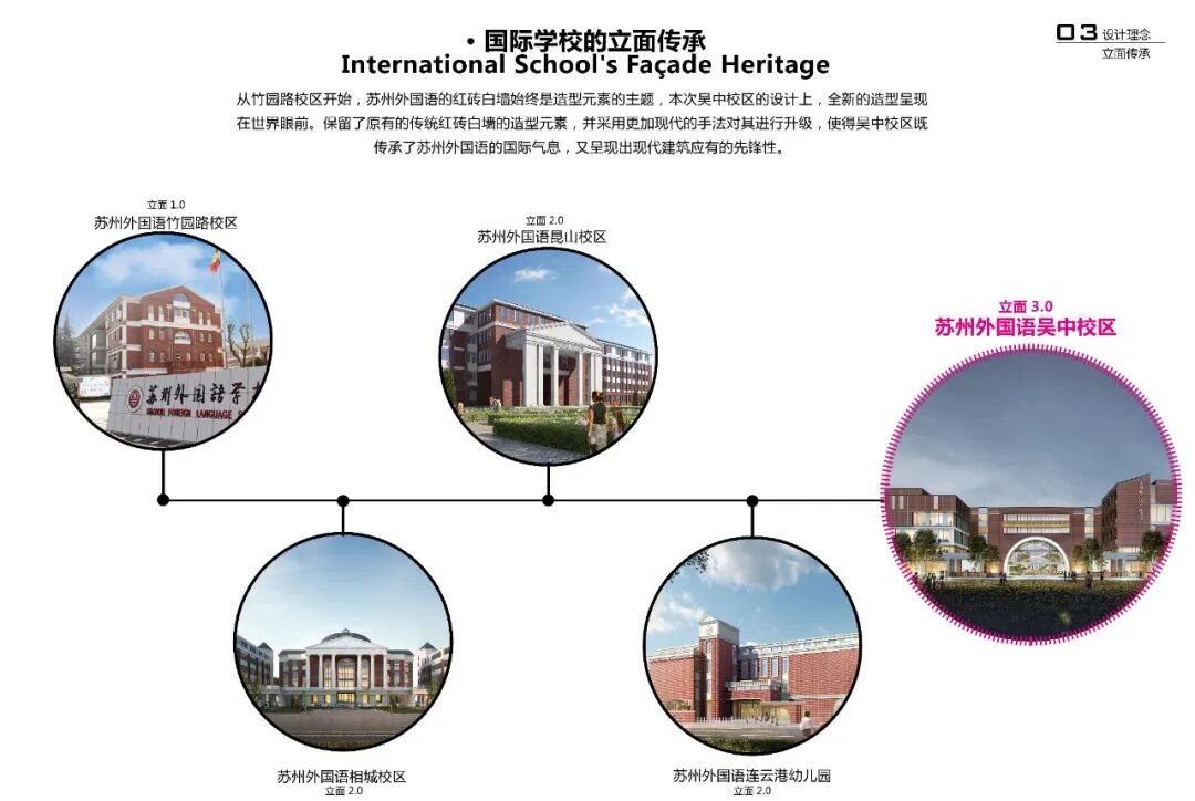 启迪设计集团先后承担了苏州外国语学校相城校区、昆山校区和连云港校区的设计工作。立足多次学校设计的磨合和经验总结,启迪设计团队在苏州外国语学校吴中校区的设计中引入了更加先进的国内外教育建筑设计理念,旨在打造一座全新的国际教育社区。