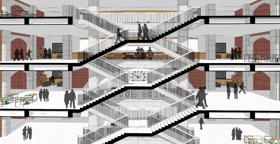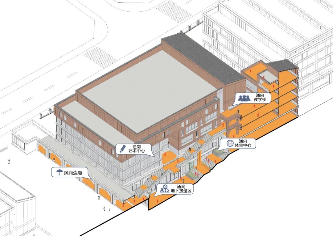 K12教育面向的学生种类繁多,学生们的年龄“从小到大”,他们的要求“变化多端”,老师在教学上“中外结合”。在这样的条件下,传统的校园空间已经力不从心,面对国际化的K12教育显得苍白无力。“共享”“复合”“渗透”便成为了空间延续和设计的主题。竖向维度上的多重空间让原本单一的校园走廊变得富有趣味,不仅能从五层教学楼直达地下负一层学生接送等候区,多种交流活动也能在同一个竖向维度上同时进行。