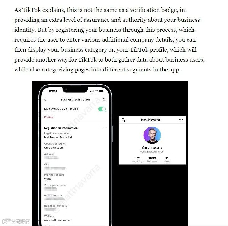 TikTok表示,“商业登记”选项与验证徽章不同,它为企业身份提供额外的保证和权威。但是通过此选项注册企业,需要用户输入各种额外的公司详细信息,然后用户才可以在TikTok的个人资料中展示其业务类别。