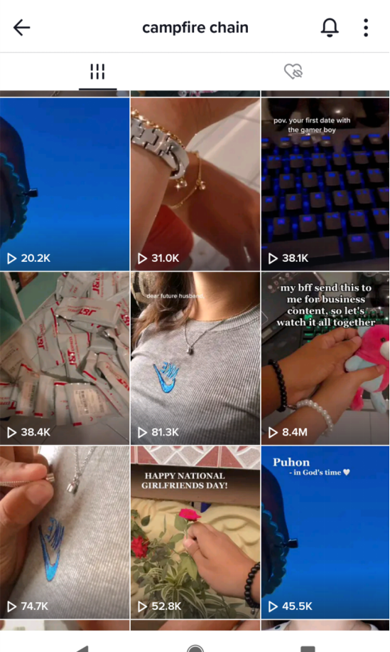 @campfirechain目前有11万+粉丝,发布的短视频内容基本上以饰品为主,偶尔有真人出镜。博主年轻开朗,非常有亲和力,其中过万、过百万播放的短视频也不少。