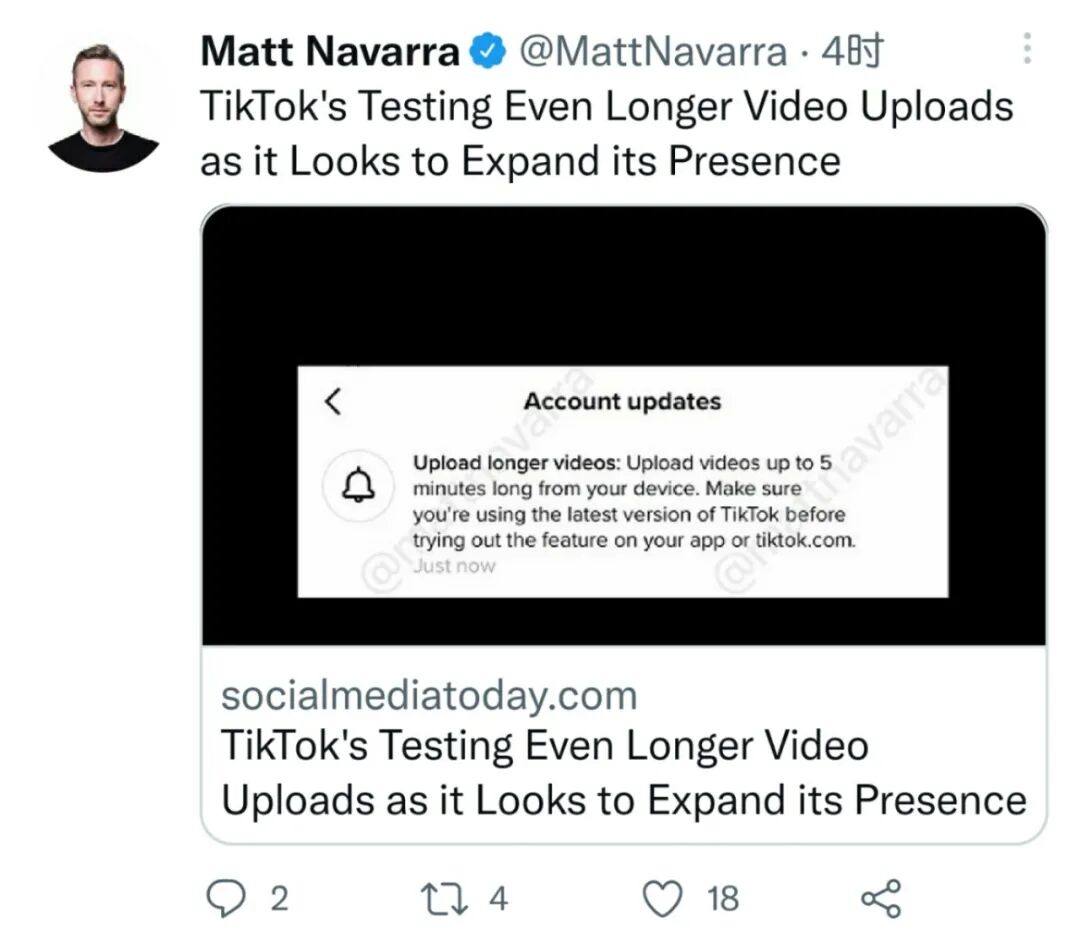 此前,TikTok已经多次延长其视频长度限制。从最初的15秒,到后来的60秒,今年7月延长至3分钟,再到如今的5分钟。而更长的时间将允许更多的创意空间,也将使TikTok能够插入更多的广告位。而给予用户5分钟的视频时长,将再次扩展TikTok的用户群,增强其核心竞争力。
