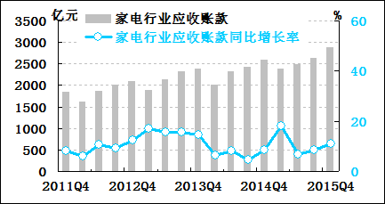 经初步季节调整,截至四季度末,家电行业应收账款为2870.8亿元,同比增长10.9%,增速比上季度上升2.4个百分点,连续2个季度出现上升,比主营业务收入增速高8.8个百分点。经测算,本季度家电行业应收账款平均周转天数为44.1天,比上年同期增加3.1天。