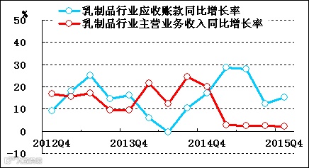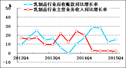 经初步季节调整,截至2015年四季度末,乳制品行业应收账款为299.4亿元,同比增长15.2%,增速比上季度上升3.0个百分点。经计算,四季度应收账款周转天数为26.6天,比上年同期增加2.7天,回款压力略有加大。