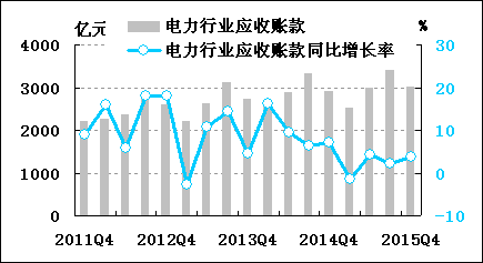 经初步季节调整,截至2015年四季度末,电力行业应收账款为3025.7亿元,同比增长3.7%,增速比上季度上升1.4个百分点。四季度电力行业应收账款周转天数为18.9天,比上季度减少1.3天。