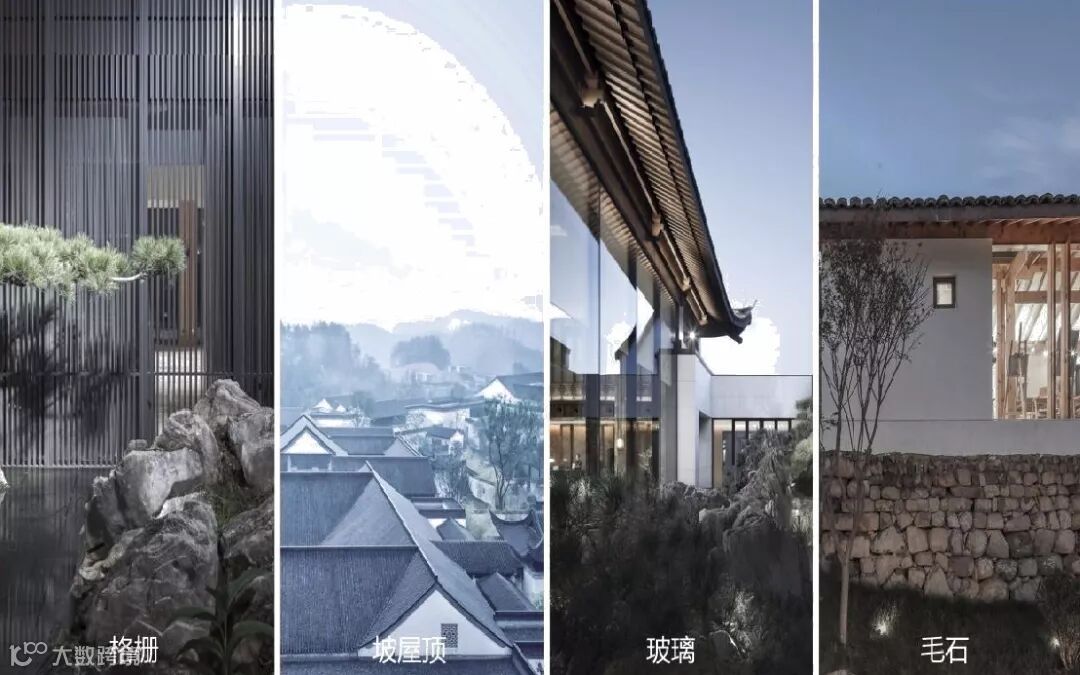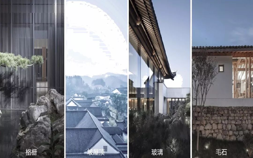 提取传统建筑的材料元素,如坡屋顶、木格栅、毛石墙等,将它们进行简化、提升和创新,配以景观倒影池、密竹,凝聚成一股宁谧的东方气韵。