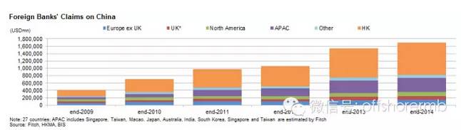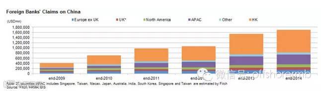 套利模式主要是CNY/USD套利差或者汇差,由此衍生出CNH/CNY套利。具体套利盘大小方面,其实是相当可观的,规模估算方面,考虑到境内银行的外币贷款在2013年以后管控比较严格,套利盘往往需要借助境外银行获得USD融资,所以境外银行业的统计数字提供了很好的参考。这个方面我主要参考FITCH、BIS和外汇局的数字。
