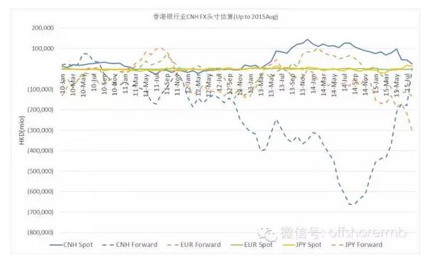 下图显示对于EURO和YEN,香港银行同样也很少持单边头寸,但是远期头寸视市场方向常年维持在500至1000亿港币的规模。考虑到国内经济以及人民币业务对香港银行业的重要性,银行根本不愿意提供CNH远期头寸服务是一件很怪诞的事情。对此我只有一个解释,那就是8/11汇改把CNH老玩家成批成批洗出局,而新的生态还没有建立起来,这时候传统的市场服务者,也就是银行,采取观望的态度,不愿意轻易涉入。