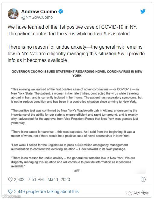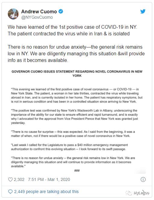 就在今(3/1)周日晚间纽约州确诊第一个新冠肺炎案例。州长 Andrew Cuomo 宣布此名确诊病患为一30多岁女子,住纽约曼哈顿,曾到伊朗旅游回来。