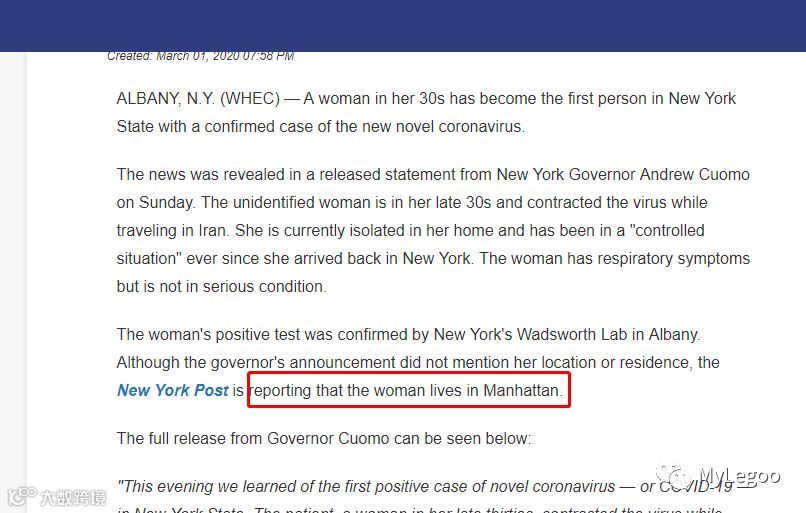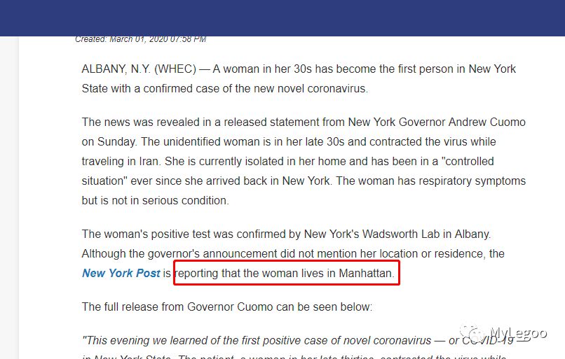 库莫的推文还配有一份声明说,该病例是一名30多岁的女性,她在伊朗旅行时感染新型冠状病毒,“患者有呼吸道症状,但病情不严重,自抵达纽约州以来病情得到控制。”声明说,该病患目前正在家隔离。