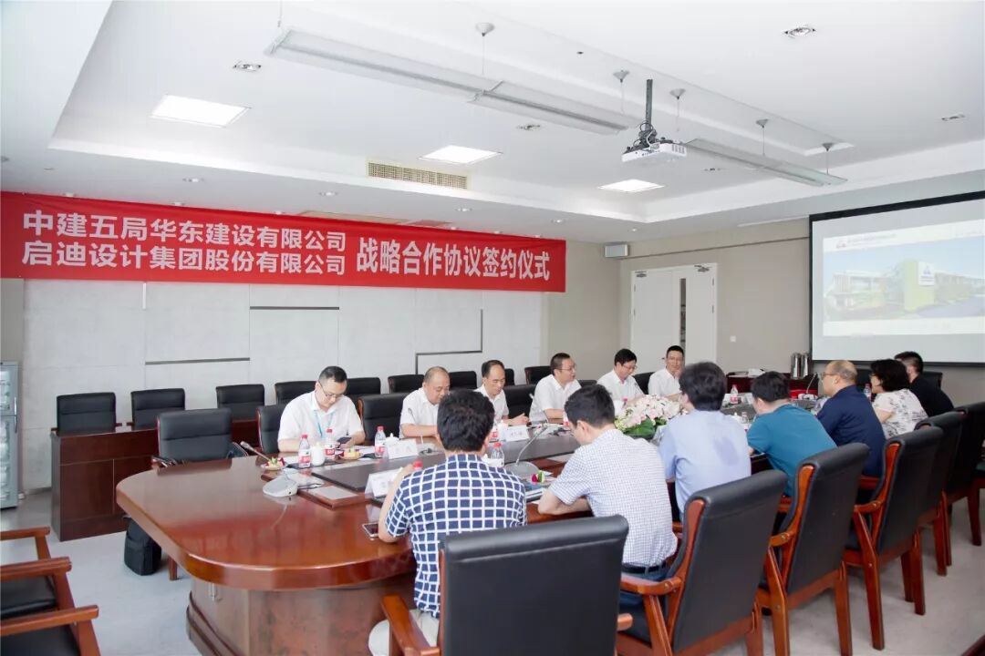 我司查金荣总裁、张斌副总裁为中建五局华东建设有限公司钱元总经理等领导介绍了启迪设计集团股份有限公司的发展历程和近几年所取得的成果,公司2016年上市以来,凭借资本市场的助力和清华启迪平台的协同合作,已初步完成全国化布局,在加强公司全过程一体化设计服务的基础上,通过收购、参控股等投资方式,不断完善产业链,加强在绿色节能运营、大数据支撑、工程建造管理等领域的发展和延伸,并进一步向高端产业转型提升,致力于打造精细化、专业化、集团化的建筑科技服务领军企业。