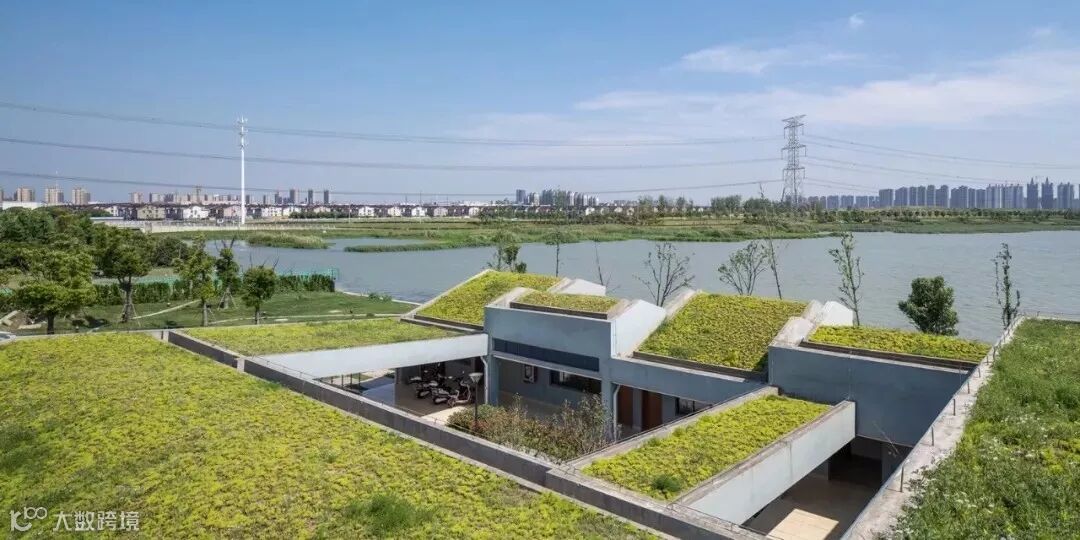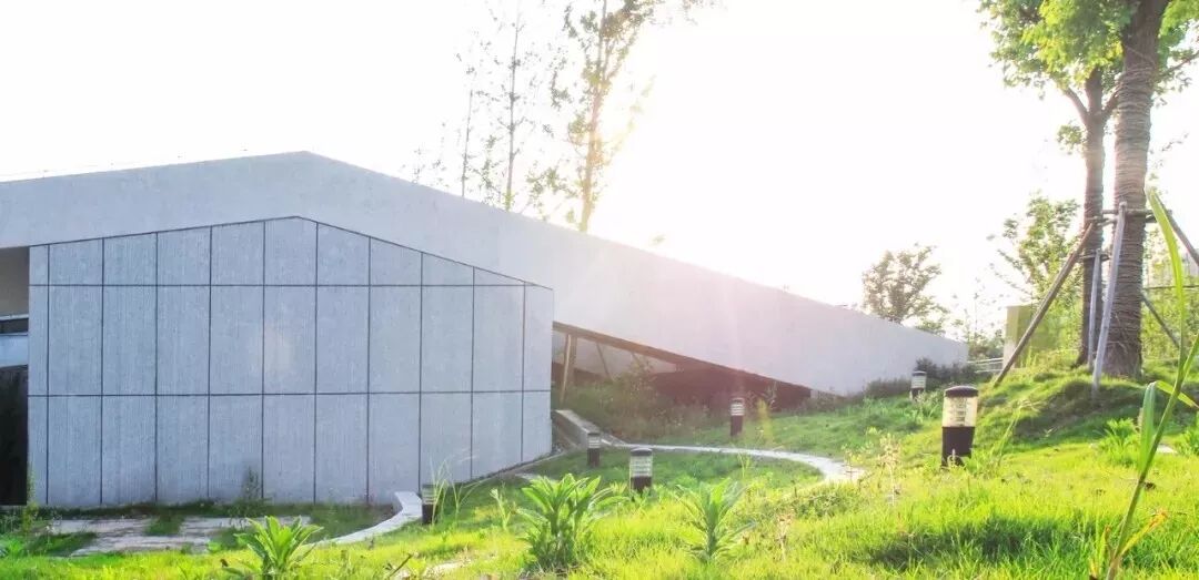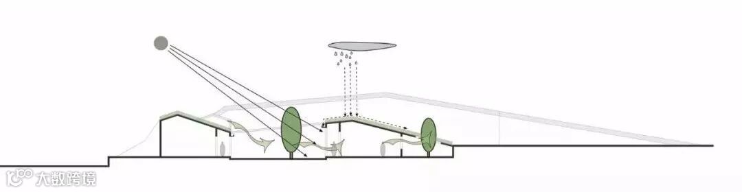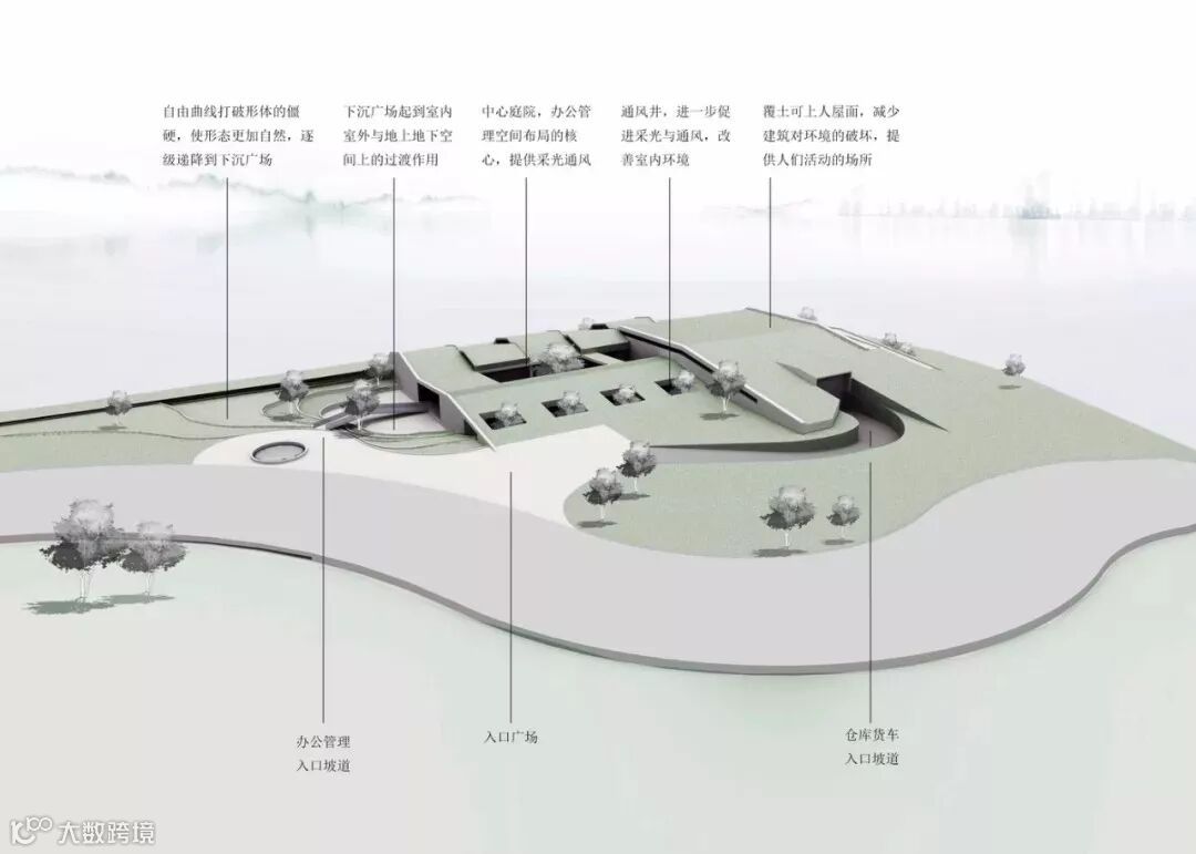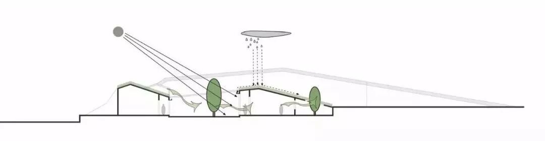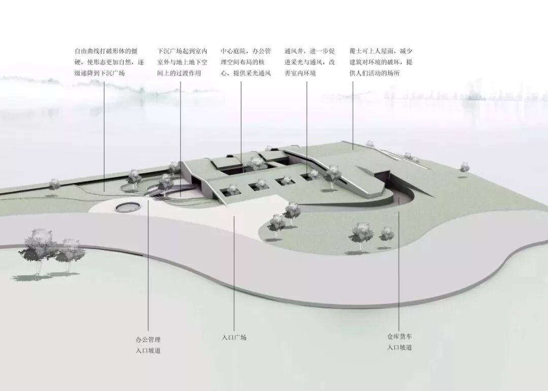 为了让仓库进一步融入到滨湖环境中去,我们把仓库下沉到地面以下,但保证室内地平标高在太湖警戒水位线高程之上。仓库屋顶建造成斜坡状,绿植覆土由湖边草坪逐渐爬升到仓库屋顶,形成屋顶覆土绿植,自然地把仓库掩埋在环境当中。