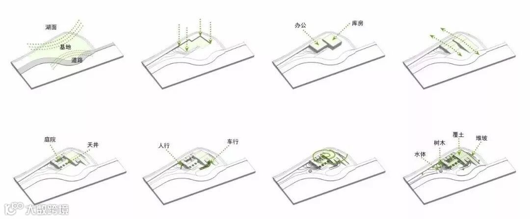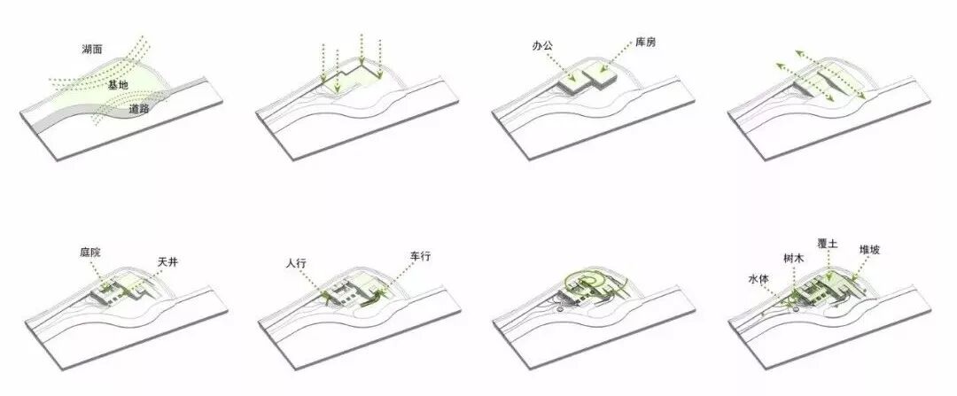 我们选了一个隐蔽的地方,来造这个仓库。建造场地由岸边车行道的一条小支驶入,与湖岸主要休闲景观绿地之间有一条小河隔开,并呈半岛状,微微伸向水中。这样的选址,让物资库在大区位上,保证了对于湖岸线景观带的最大保持度,最小破坏度,无论是从湖岸上,还是从湖中间看过来,这一处位置都是景观视线最为隐蔽的地方。