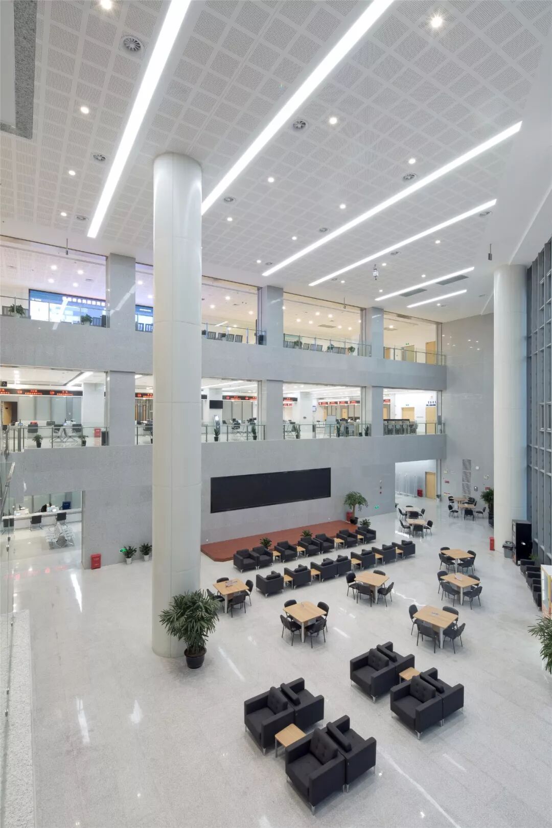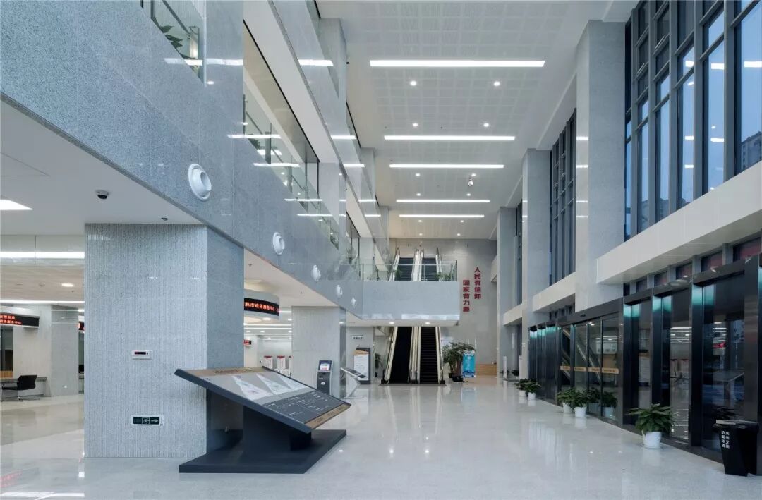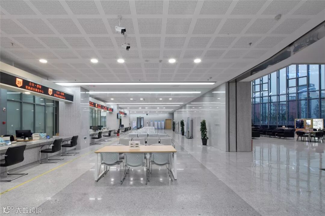 门厅作为整栋建筑室内外的节点及过渡空间,应是建筑空间性格的集中体现,项目设计的精华浓缩于此,让人进入第一时间便能感受到行政服务中心的公开、高效、便民与亲民的政府形象。