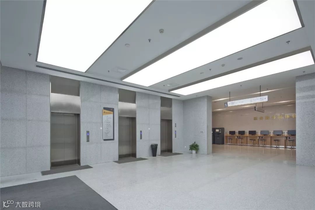 电梯厅作为一个连接水平和纵向空间的过渡空间,设计上总体延续大厅的设计手法。顶面仍采用发光膜,特意将其规格与大厅有所区分,凸显出其空间的特殊性。