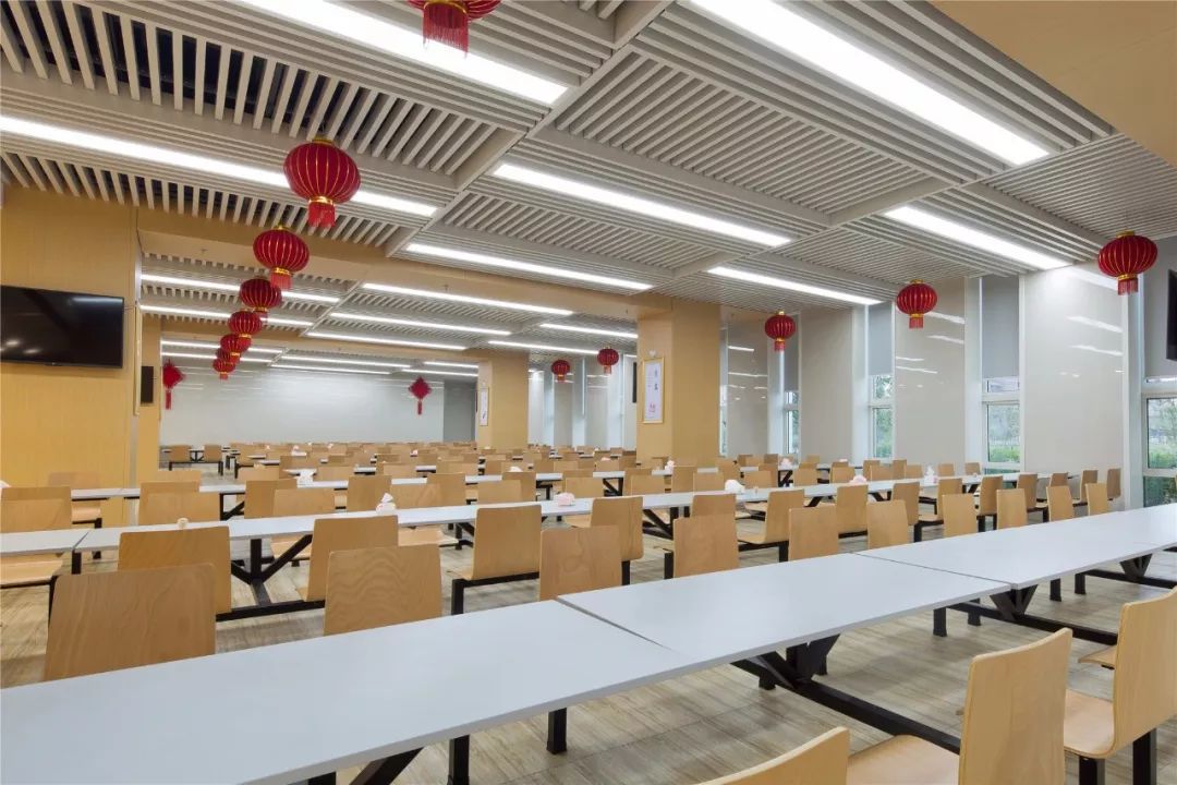 餐厅亦遵循我们的概念,线性、块面在此空间强化,空间色彩上采用木色和白色,顶面的条形格栅通过区块化错向(灯具仍方向一致)处理, 使空间上既简洁又富有层次感。