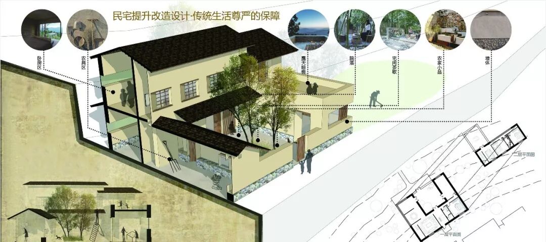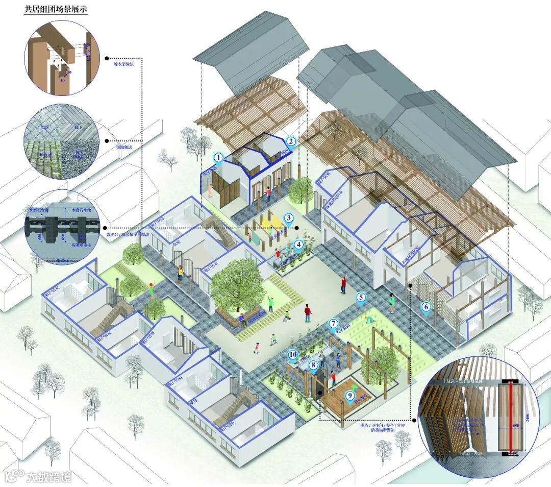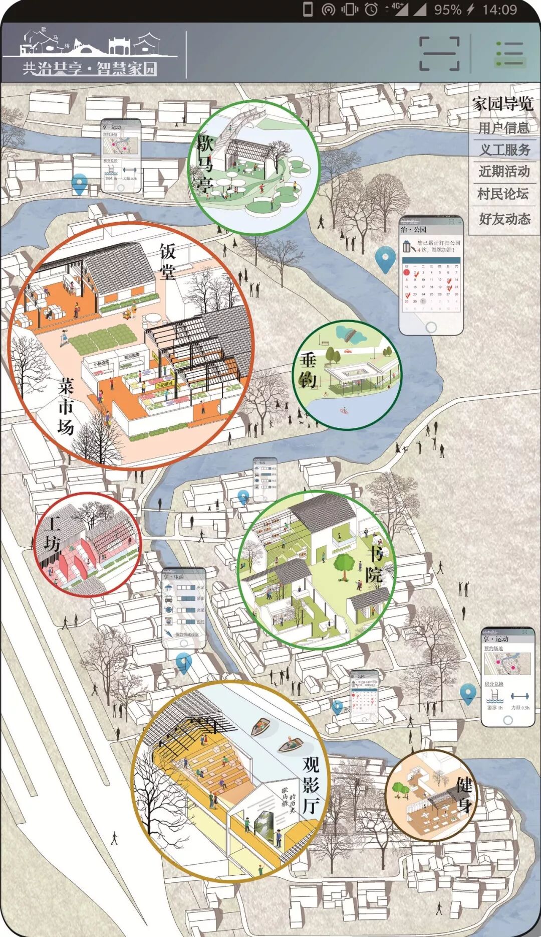 设计师采用“共居组团”的概念,通过对破损建筑的拆除、修复和灵活改建、加建,为共居组团重新植入功能,完善共居组团布局。同时结合大数据导入,搭建在线智慧平台,让居民体验共享设施、义务服务和评价互动等服务,为村民提供一个和谐、共治、共享的智慧家园。