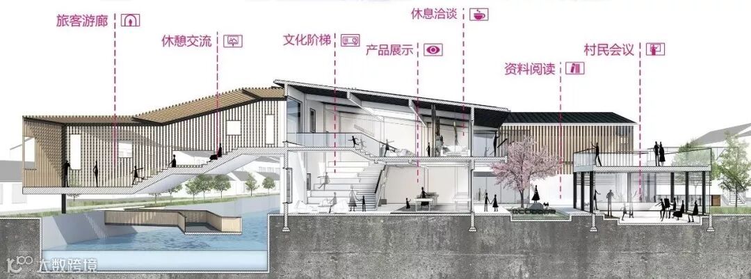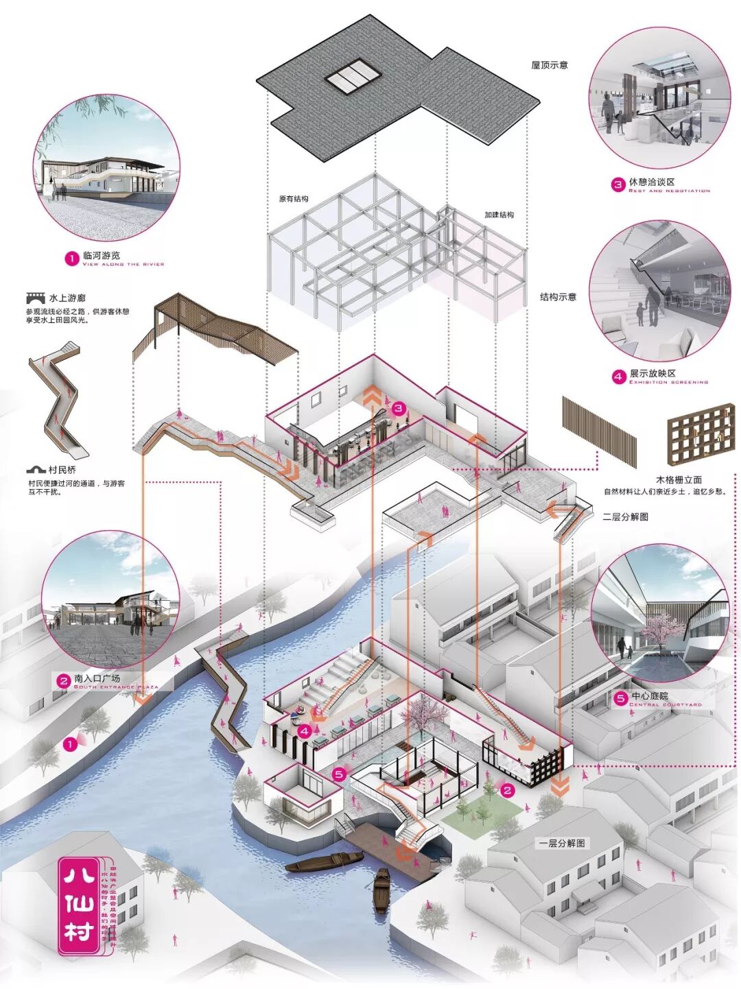 为此设计师以“水八仙”农作物作为产业运行的核心作物,对原有村庄的民居升级改造改建,作为“插件”置入水八仙主题产业链,同时开放旅游展示水八仙农作物的种植、加工、包装、运输、销售等一系列环节,让村民与外界形成良好的交流沟通,创造更加宜居的生活生产空间环境,切实提升村民的获得感与归属感,并为未来村庄提供一种普遍适用的可持续发展模式。