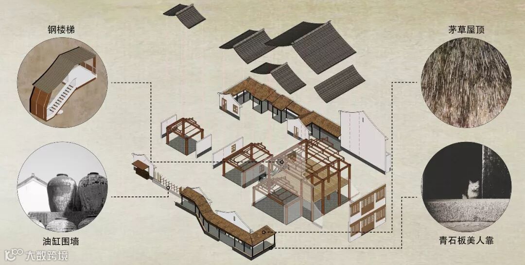设计最大限度的保留了村中少有的古老宅院外在形态,希望能强调地域特征和文化传承的重要性。利用已经废弃和控制的建筑进行改造,置入合适的文化载体功能,使得整个水乡村落保留提升,并且用传统材料进行创新设计,在新旧共生的建筑空间内激发更多源于村落内核的能量和活力。